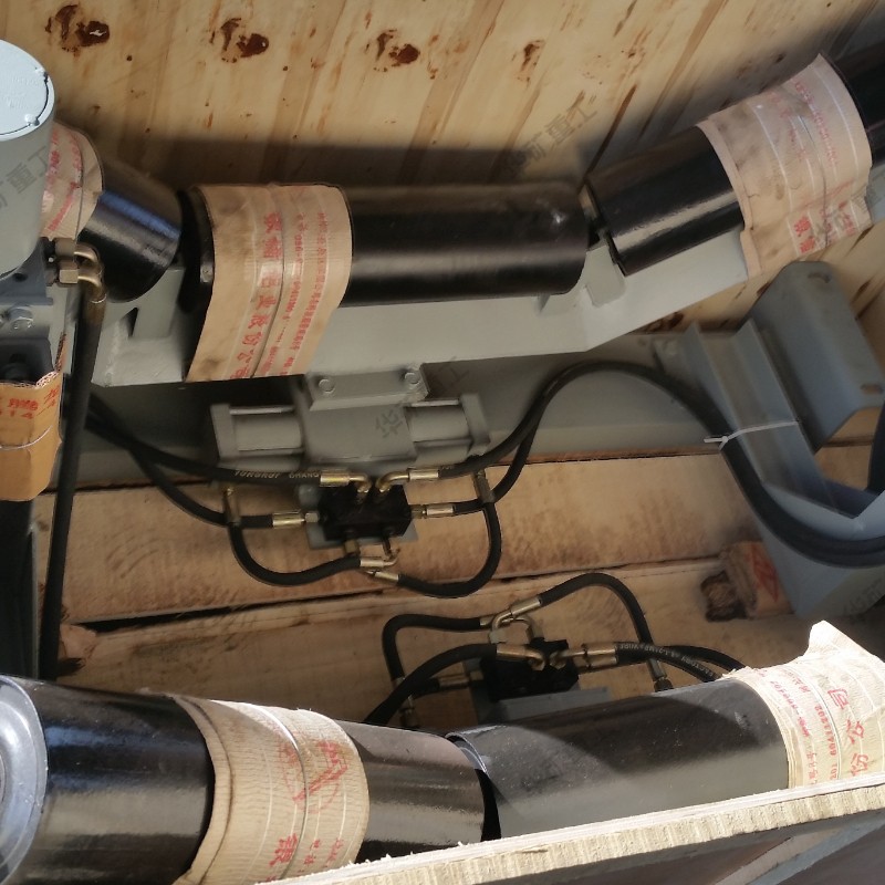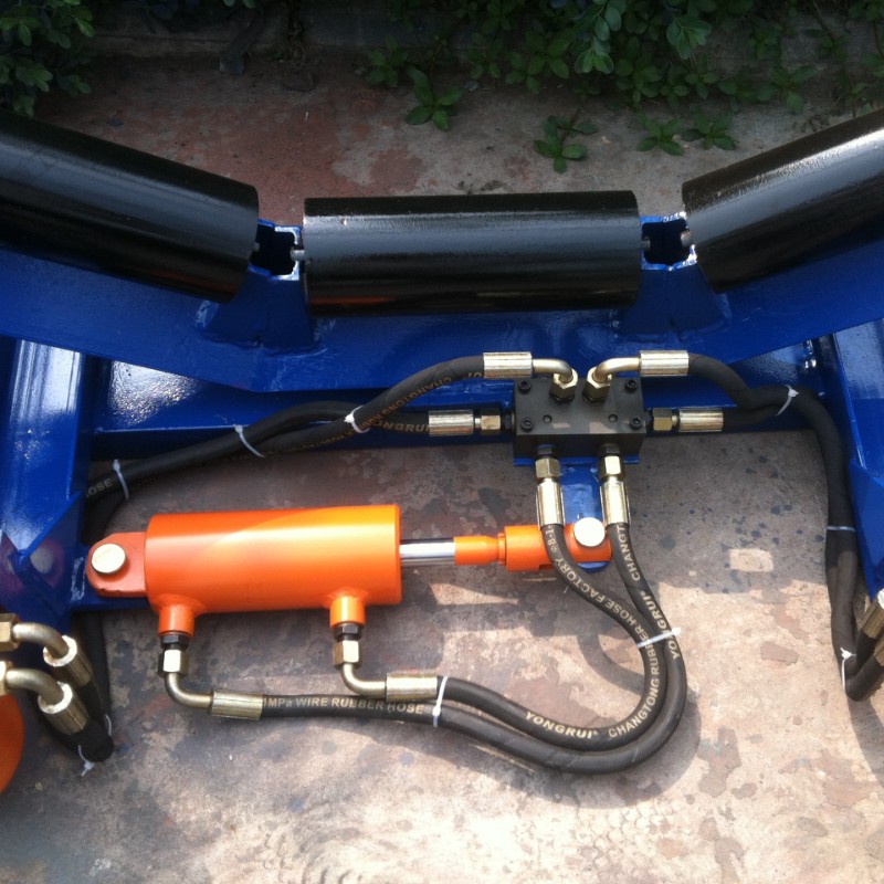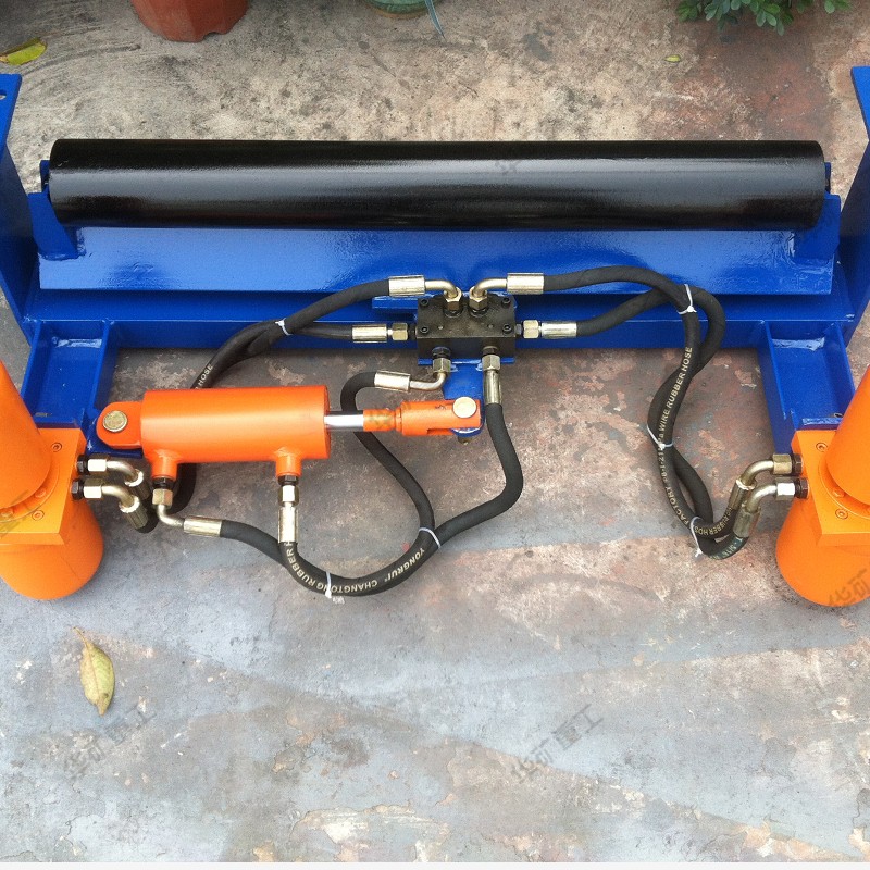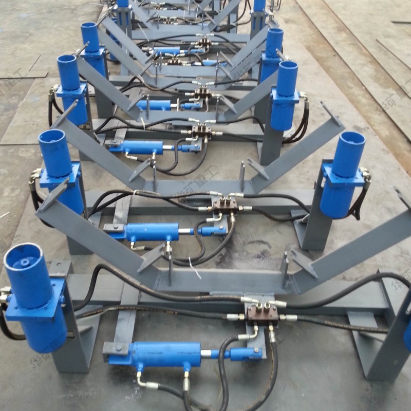 自動液壓調(diào)偏裝置是由檢驅(qū)輪、油泵、復合油缸、油管、固定支架構(gòu)成。當皮帶運行跑偏時,皮帶和檢驅(qū)輪接觸,檢驅(qū)輪帶動油泵旋轉(zhuǎn),輸出液壓油控制驅(qū)動油缸往復運動,帶動調(diào)心托輥偏轉(zhuǎn),使調(diào)心托輥的線運動方向與皮帶的運動方向形成一個夾角,產(chǎn)生的摩擦力驅(qū)動皮帶,是皮帶始終在設(shè)定的范圍內(nèi)運行,從而避免皮帶跑偏造散料、皮帶與皮帶機架摩擦撕帶,達到保護皮帶機正常運行的目的。自動液壓調(diào)偏裝置的核心部分為:一組液控換向閥,它是由兩個液控換向閥單體組成。每個液控換向閥分別與一套檢驅(qū)輪泵組連接,兩個液控換向閥共同控制一條油缸,來完成油缸的伸縮運動,并且每個液控換向閥之間互相影響,對油缸的控制迅速,準確。產(chǎn)品屬性、結(jié)構(gòu)組成在機架上安裝一組調(diào)心托輥,在調(diào)心托輥的兩側(cè)相同高度垂直安裝兩只檢驅(qū)輪,檢驅(qū)輪轉(zhuǎn)軸與油泵的動力輸入軸連接,分別把左右兩側(cè)的檢驅(qū)輪轉(zhuǎn)軸和油泵固定在機架上,調(diào)心托輥與左側(cè)固定支架之間設(shè)置復合油缸,復合油缸的尾部與固定支架鉸接,復合油缸的活塞桿與調(diào)心托輥的托輥架傳動部分左側(cè)鉸接,用油管把油泵的油口與復合油缸缸尾部的油口接通。 當皮帶跑偏時,皮帶邊緣觸動檢驅(qū)輪,而使油泵迅速輸出液壓油,通過油缸的油路集成塊進入油缸,從而驅(qū)動活塞桿迅速的伸出或縮回,拉動調(diào)心桿托輥轉(zhuǎn)動,使皮帶居中。